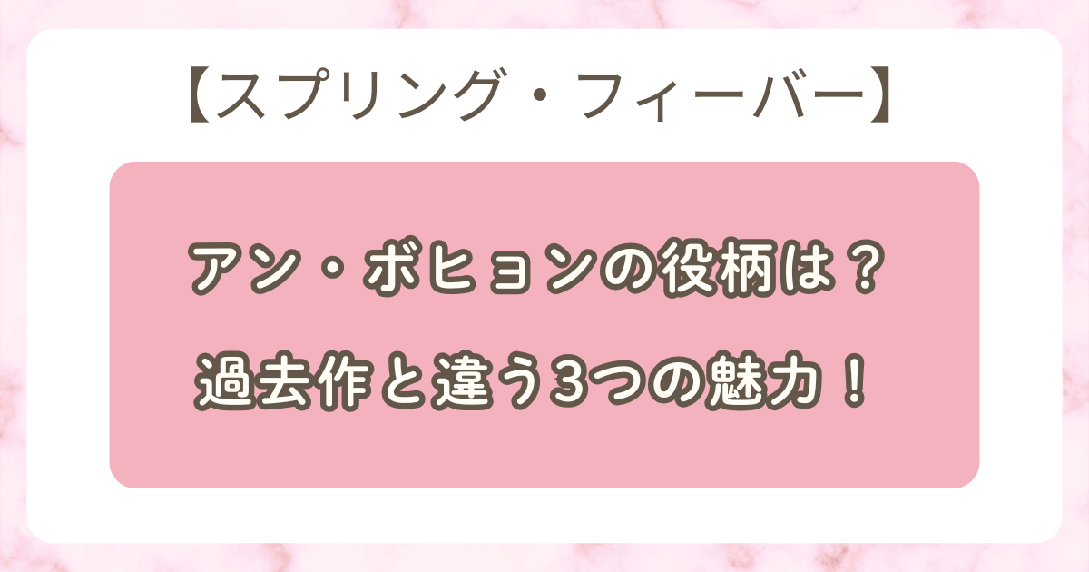 今回は、『スプリング・フィーバー』でアン・ボヒョンが演じる新しいキャラクターの魅力と、これまでの大ヒット過去作との決定的な違いを徹底解説していきます。